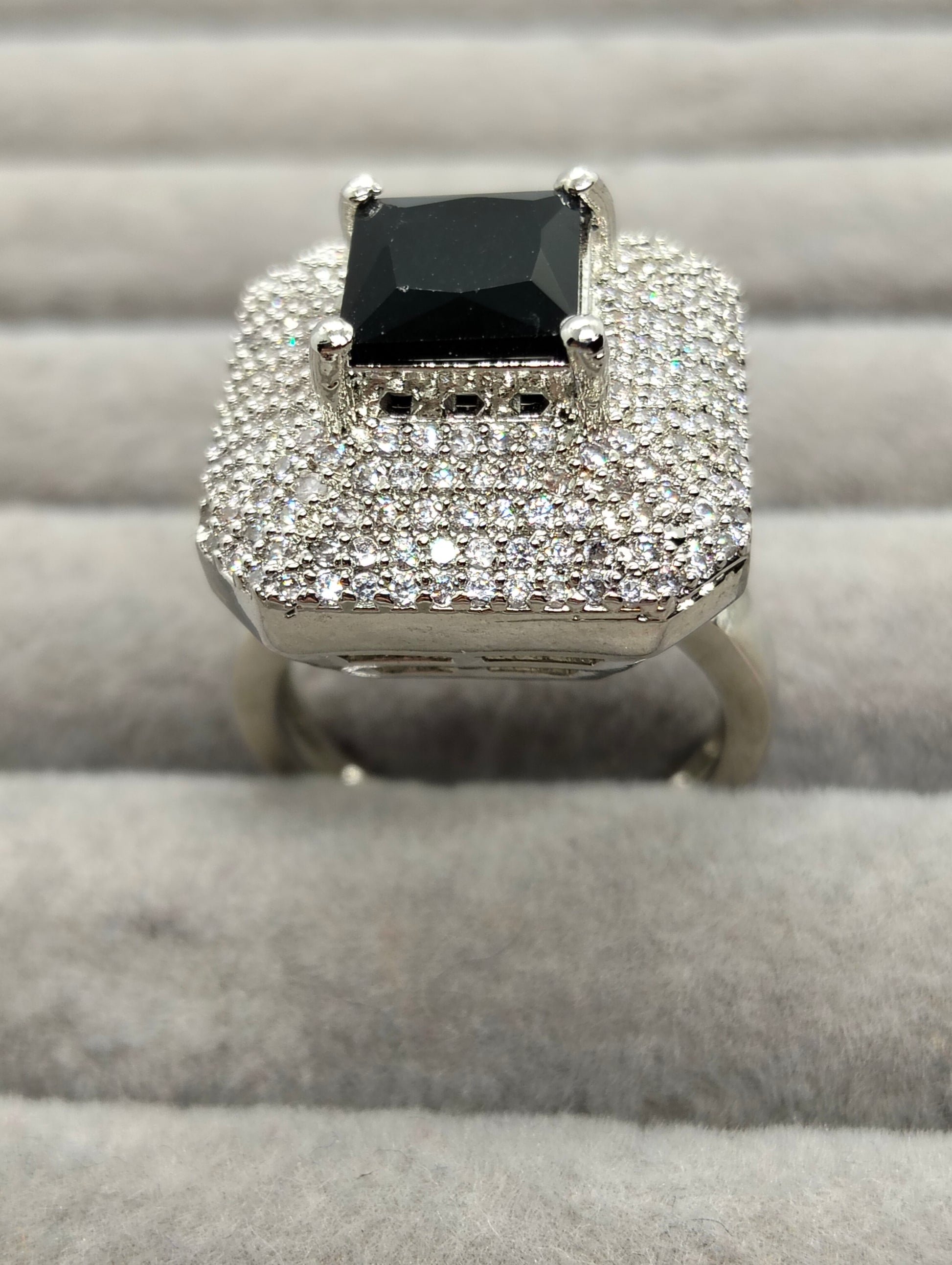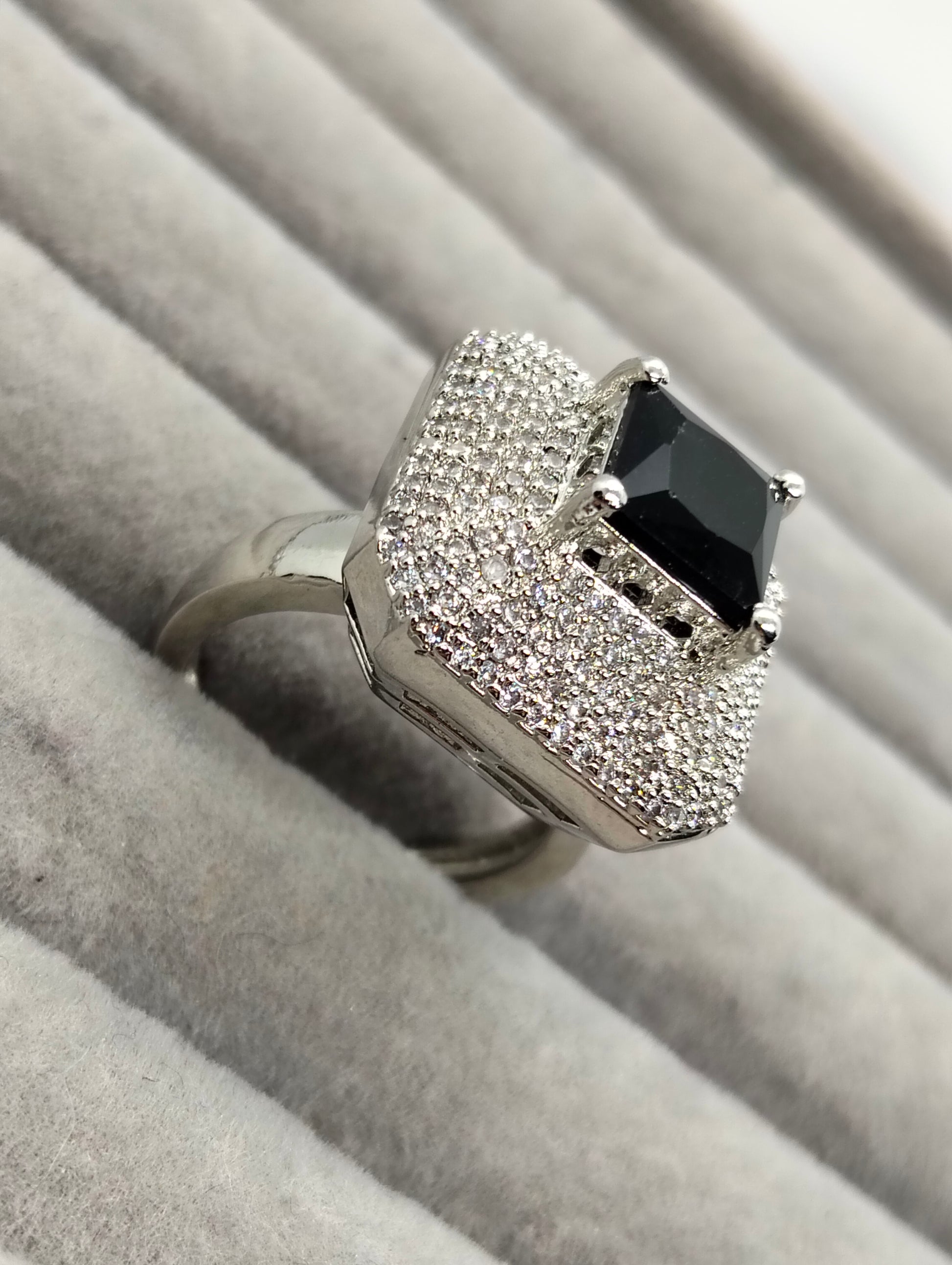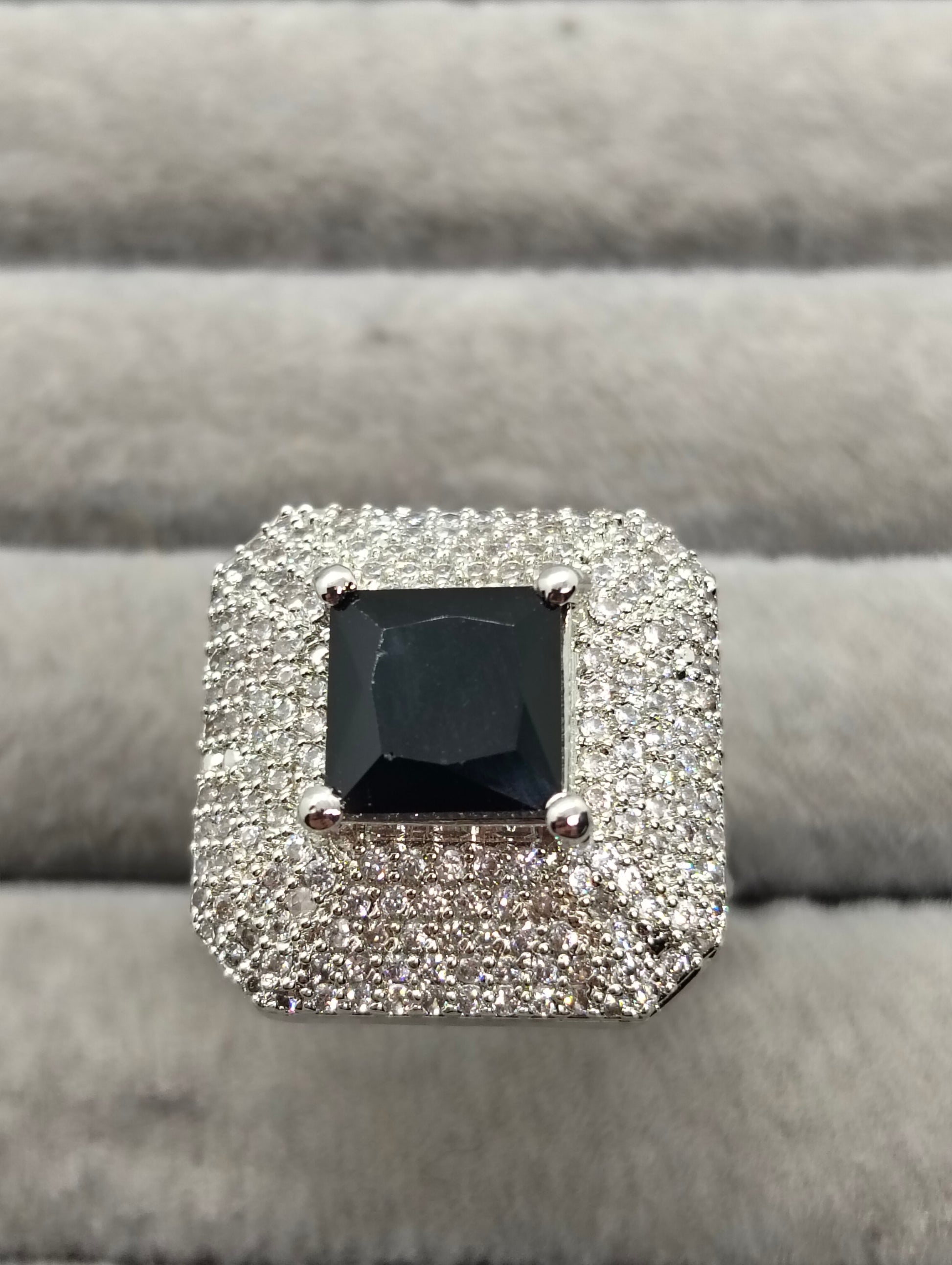This black stone ring features a one carat gemstone, adjustable sizing, and a silver rhodium plating. The gemstone offers a mesmerizing sparkle, while the adjustable sizing ensures a perfect fit. The silver rhodium plating adds durability and shine to this elegant ring. Elevate any outfit with this timeless piece.