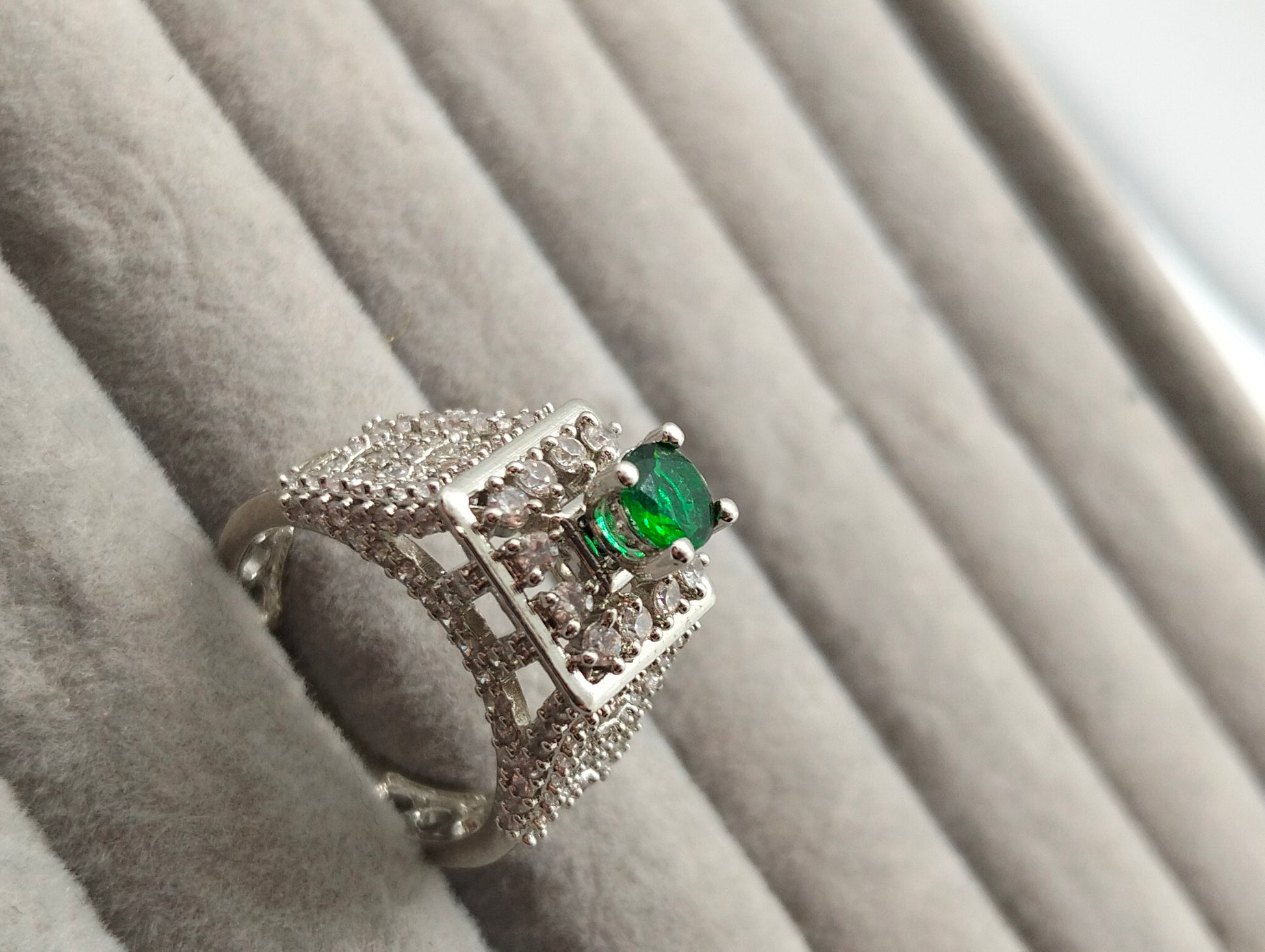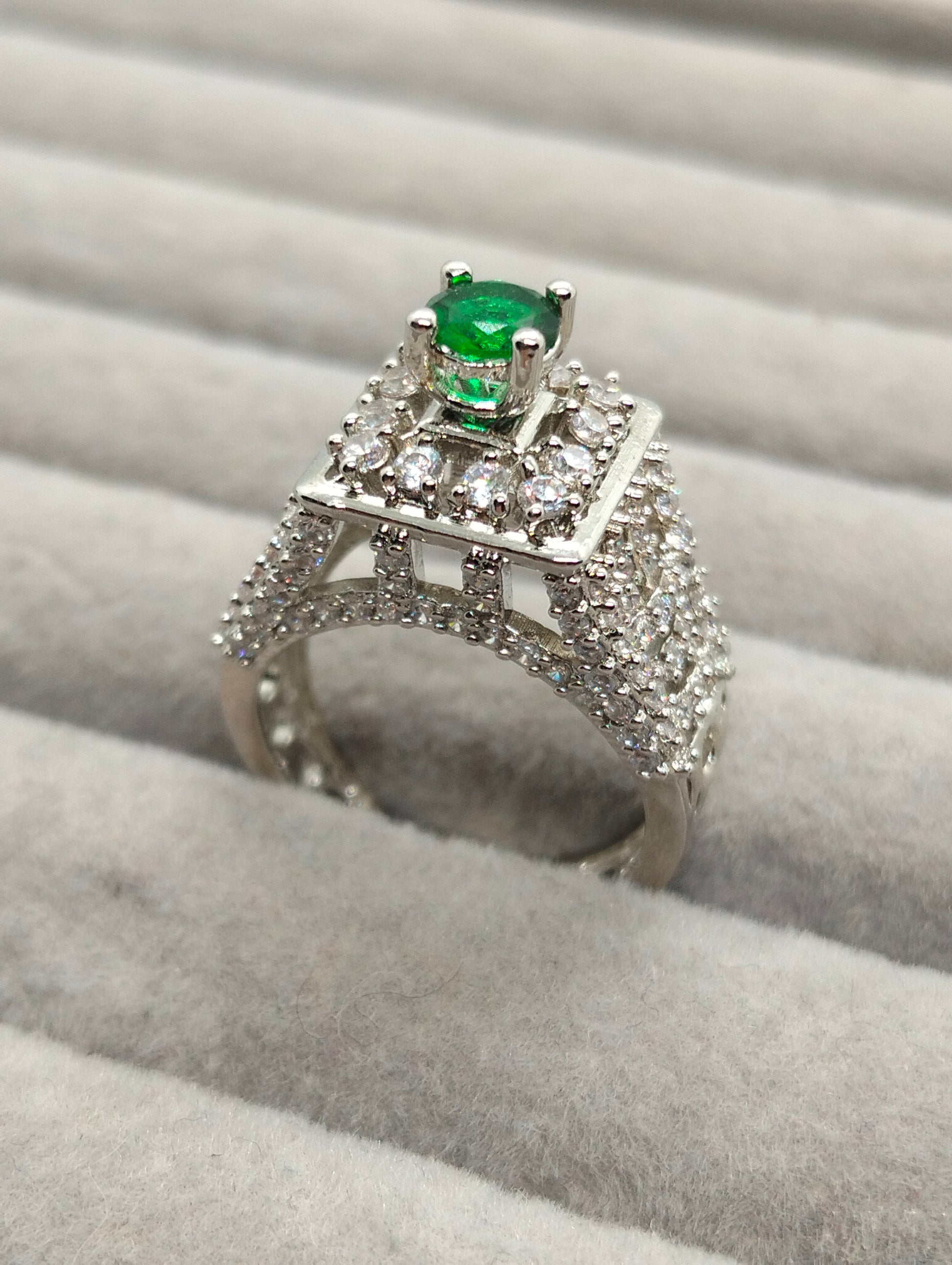 Green emerald adjustable tower ring in silver rhodium plated