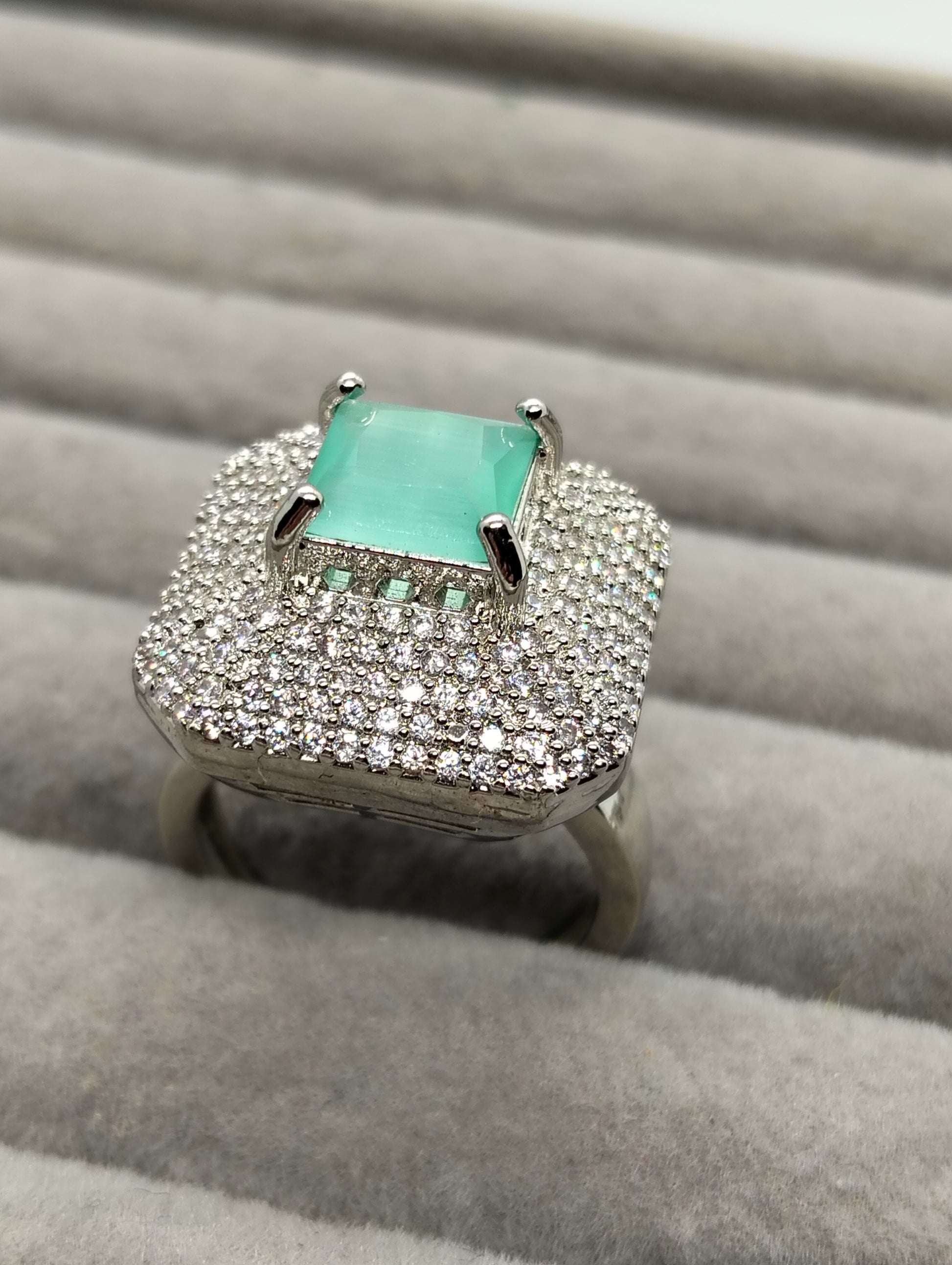 Expertly crafted with one carat of mint green stone, this silver rhodium plated ring is the perfect addition to any jewelry collection. Its high-quality materials ensure durability and timeless elegance, making it a versatile and stylish choice for any occasion. Elevate your look with this stunning and sophisticated piece.
