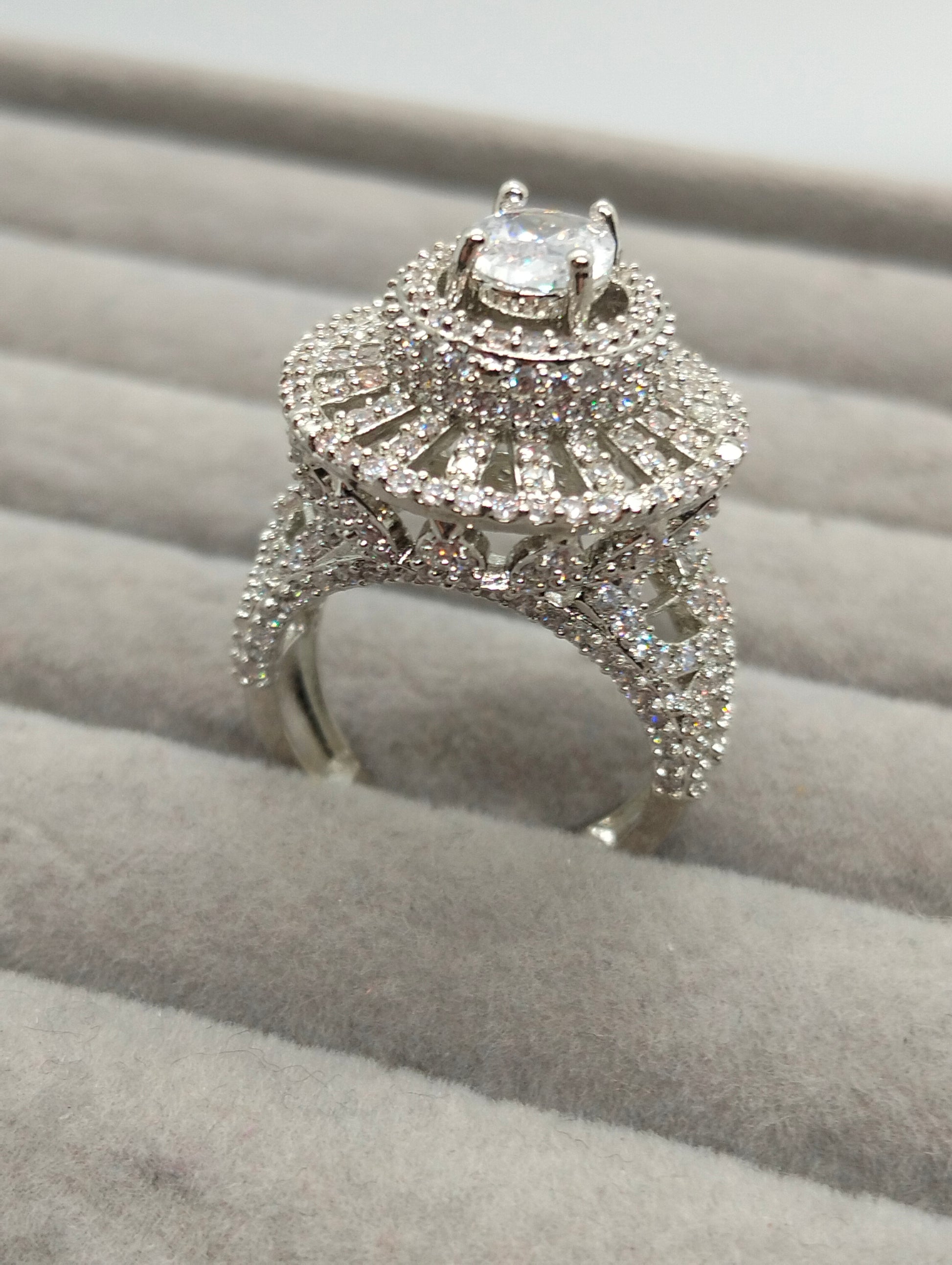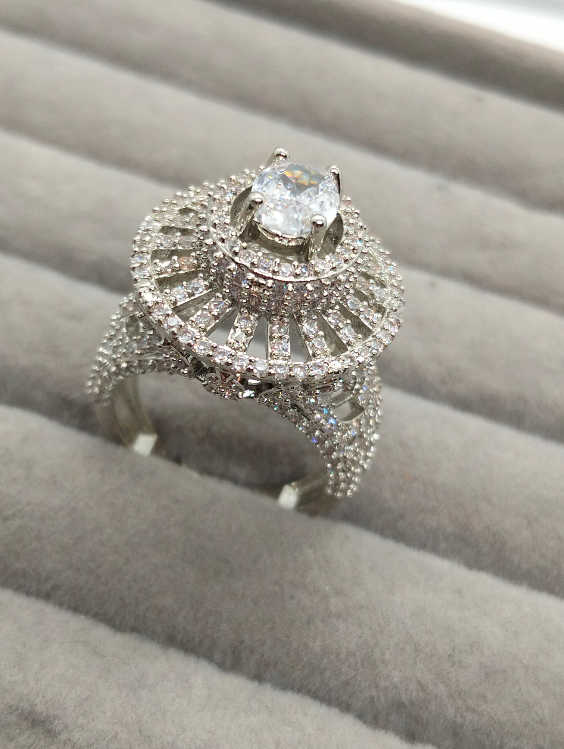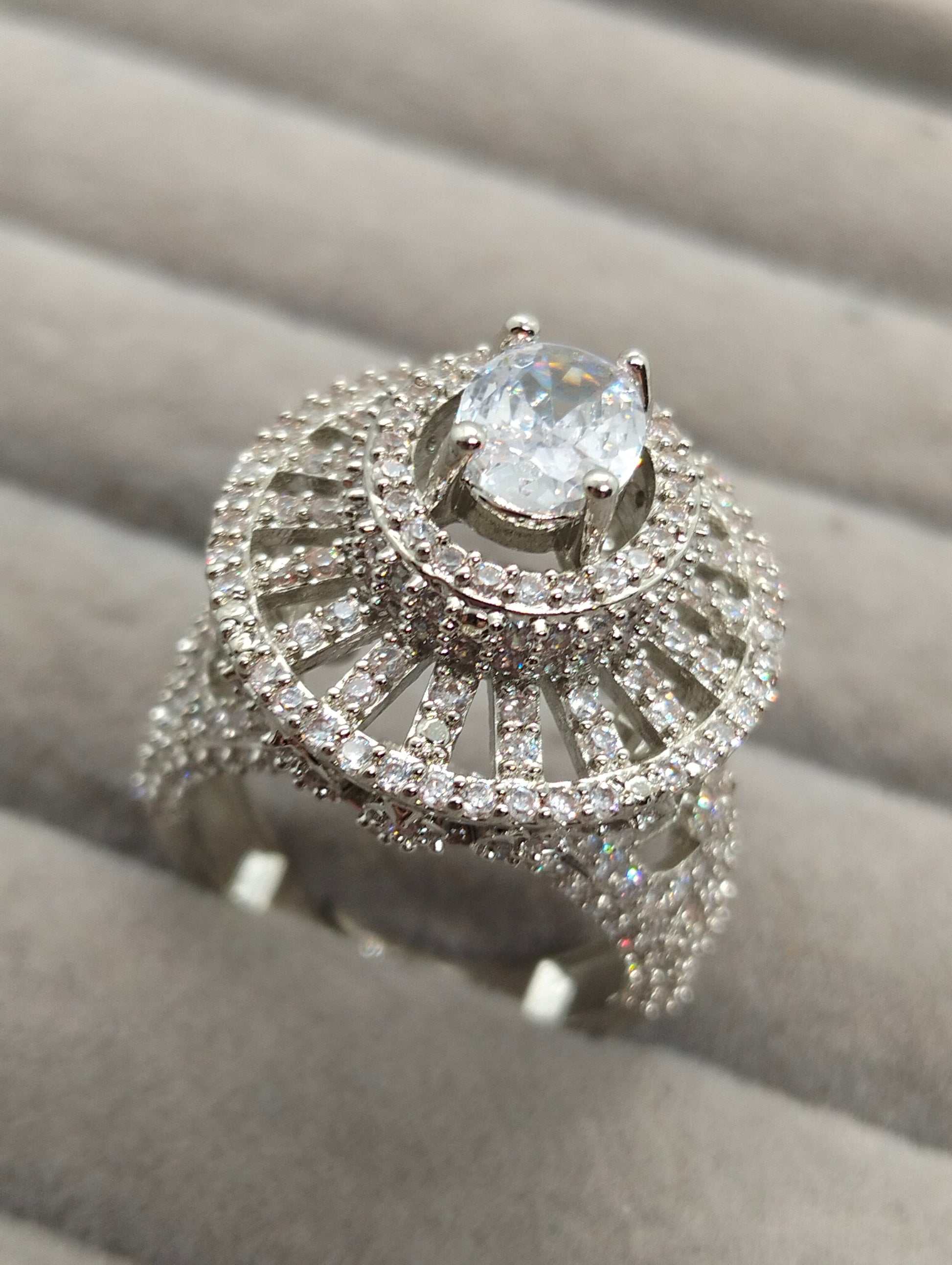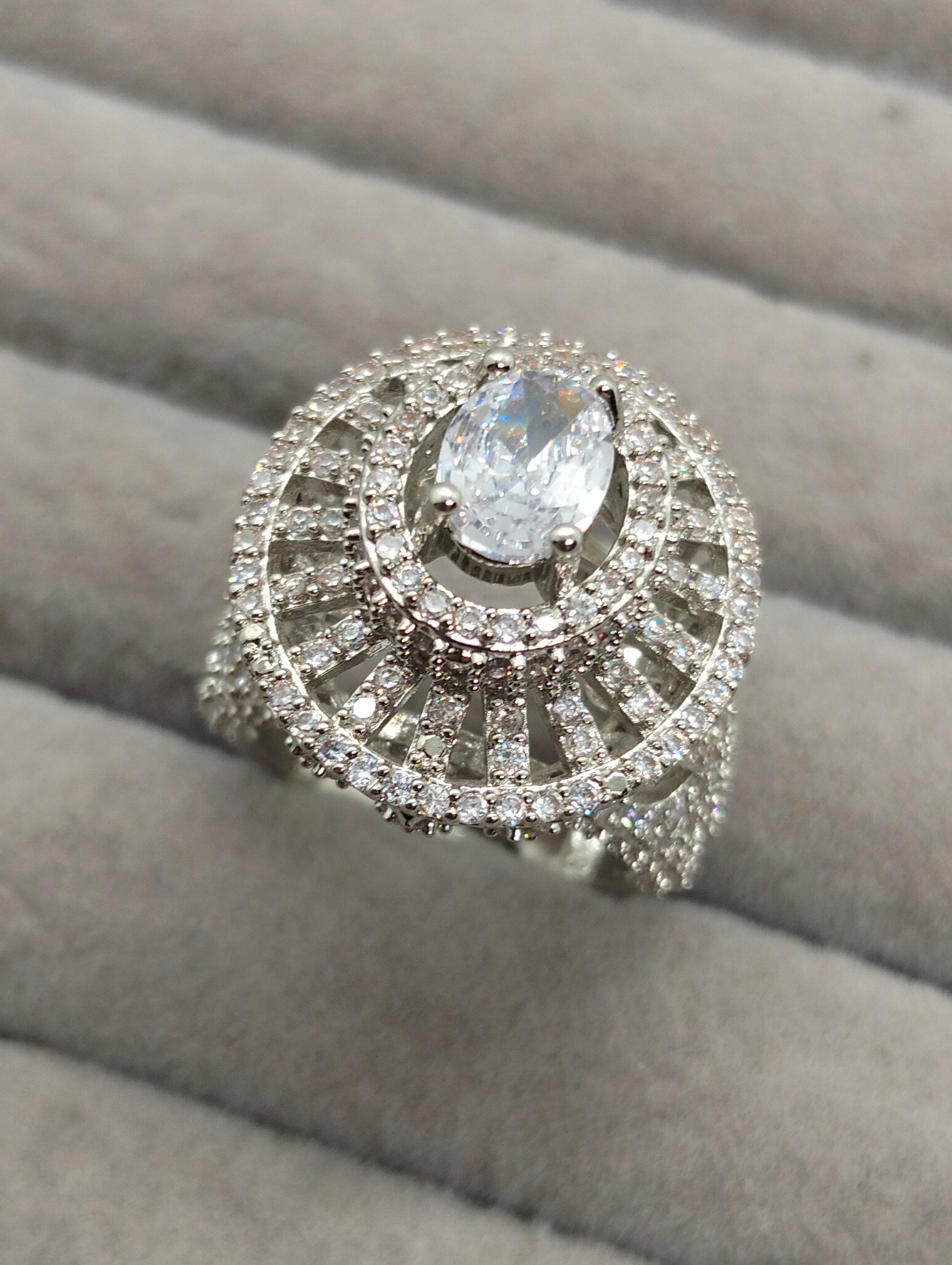 This stunning statement ring boasts a one carat semi precious stone set in a silver rhodium plated band. The elegant design and high-quality materials make it a versatile and luxurious addition to any jewelry collection. With its eye-catching sparkle and timeless style, this ring is sure to make a statement wherever it's worn.
