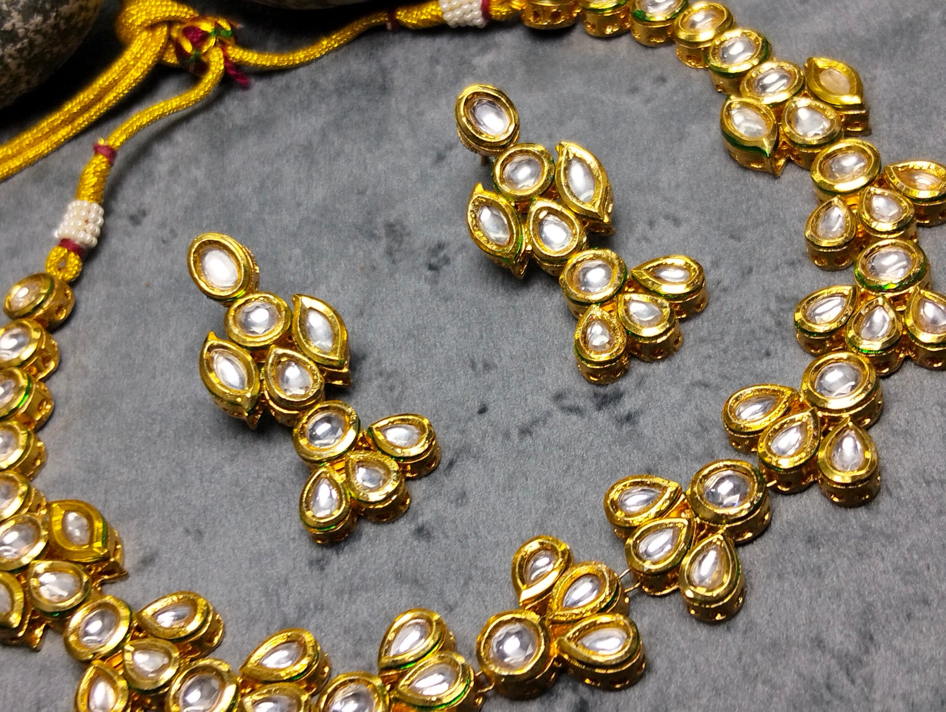 Elevate your ethnic wardrobe with this exquisite Kundan meenakari set, a masterpiece of traditional craftsmanship. Featuring intricate hand-painted enamel work combined with lustrous kundan stones, each piece showcases the timeless artistry of Indian jewelry design. The sophisticated color palette and detailed embellishments make it perfect for weddings, festivals, and special occasions. This authentic set captures the essence of heritage jewelry while maintaining contemporary appeal, ensuring you stand out with grace and elegance.