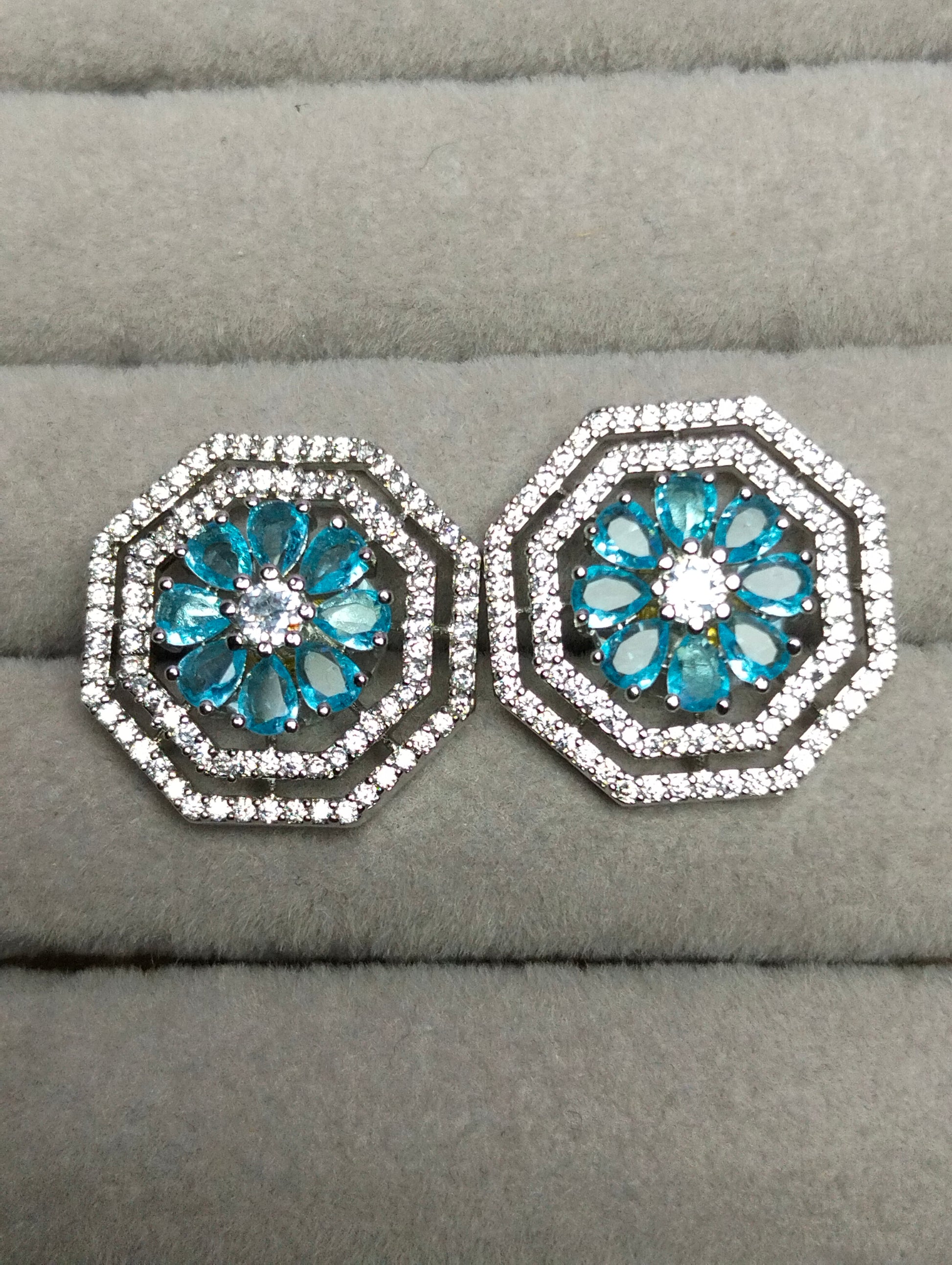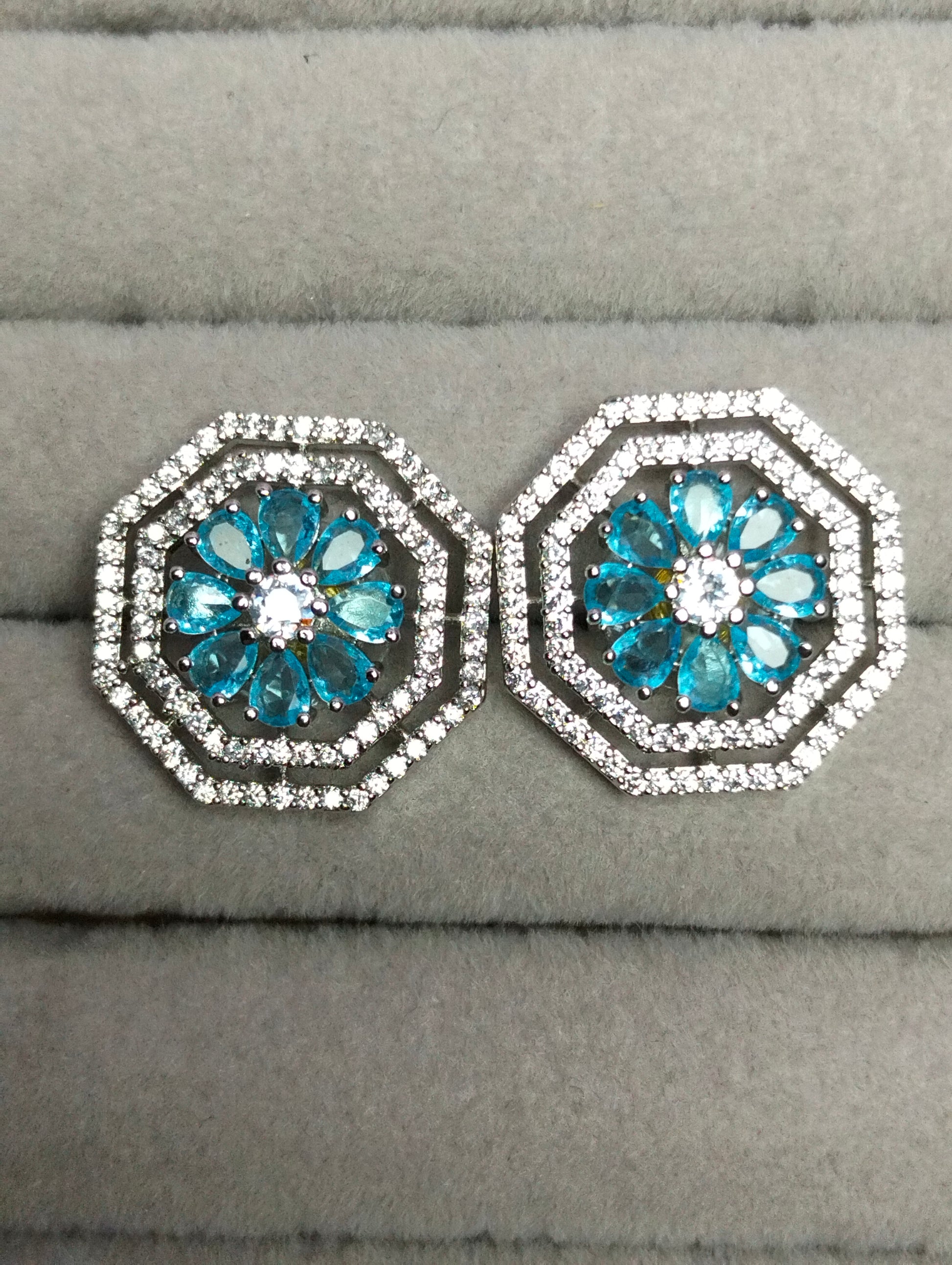 Elevate your everyday look with these striking geometric studs featuring a mesmerizing white illusion design paired with vibrant aqua blue accents. Crafted in lustrous silver, these studs offer a modern aesthetic that seamlessly transitions from casual to formal occasions. The clean geometric lines create visual interest while maintaining an understated elegance. Perfect for those who appreciate contemporary jewelry with a pop of color, these studs are an essential addition to any accessory collection.